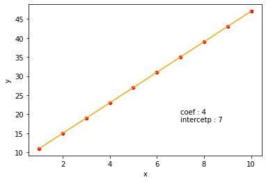 plt.text(7,20,'coef : %.0f'% reg.coef_[0])